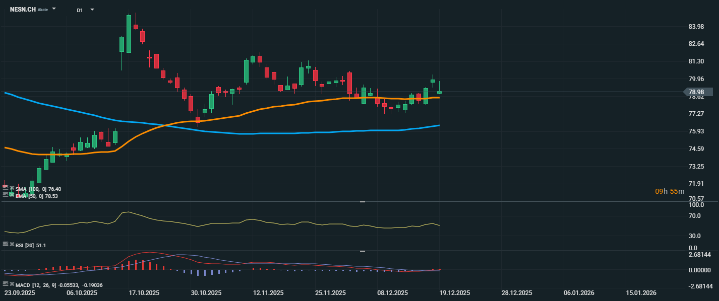 Z technického hlediska tedy Nestlé vyslalo první pozitivní signály, přičemž klíčové bude, zda se kurz udrží nad úrovní 78,50 CHF. V takovém případě by mohlo dojít k testu rezistenčních úrovní v pásmu 80–82 CHF. Naopak selhání a pokles pod EMA 50 by signalizoval návrat do bočního trendu.