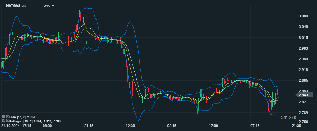 Vývoj ceny zemního plynu s použitím EMA a Bollingerových pásem na 15minutovém grafu ukazuje zvýšenou volatilitu během posledních hodin obchodování. Zdroj: xStation5