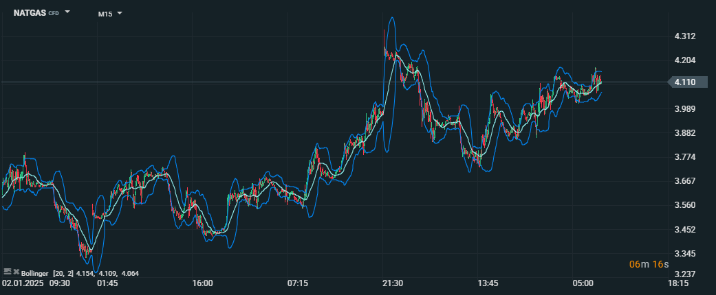 Vývoj ceny futures na zemní plyn (NATGAS CFD) na 15minutovém grafu s indikátorem Bollingerova pásma (perioda 20). Graf ukazuje růst cen směrem k úrovni 4,11 USD/mmBtu v očekávání zveřejnění zprávy o zásobách. Zvýšená volatilita a náznaky rostoucí poptávky odpovídají aktuálnímu chladnému počasí a očekávanému snížení zásob. Zdroj: xStation5