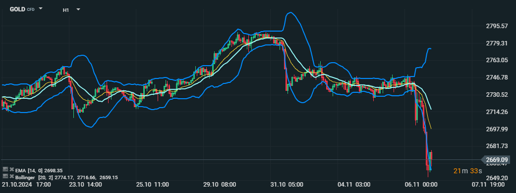 Ceny zlata prudce klesají, když trh reaguje na vítězství Trumpa ve volbách, sledováno pomocí indikátorů EMA a Bollingerova pásma. Zdroj: xStation5