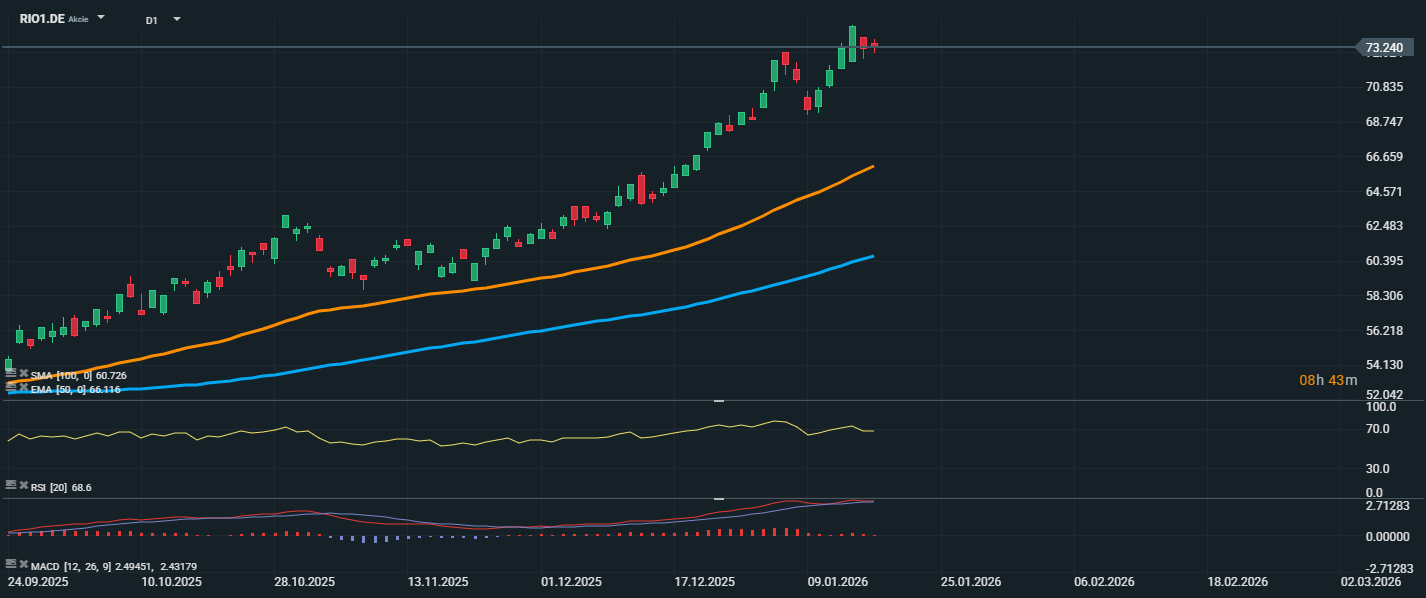 Akcie společnosti Rio Tinto pokračují v dynamickém růstu a aktuálně se obchodují na úrovni 73,24 EUR. Cena se výrazně drží nad klouzavými průměry, přičemž EMA 50 se nachází na 66,12 EUR a SMA 100 na 60,73 EUR. Tato technická situace potvrzuje přítomnost silného býčího trendu. RSI dosahuje hodnoty 68,6, tedy je blízko hranice překoupenosti, což může naznačovat možnou konsolidaci nebo krátkodobé zpomalení růstu. Po výrazné růstové sérii došlo v posledních dnech k mírnému zklidnění tempa, což je běžné po silném trendu.