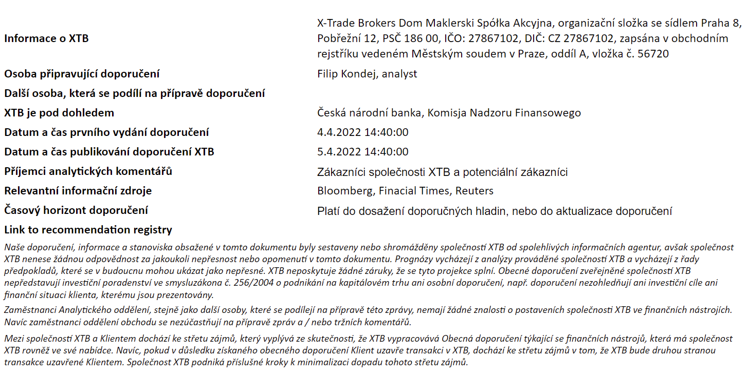 Rozdílové smlouvy jsou komplexní nástroje a v důsledku použití finanční páky jsou spojeny s vysokým rizikem rychlého vzniku finanční ztráty. U 71 % účtů retailových investorů došlo při obchodování s rozdílovými smlouvami u tohoto poskytovatele ke vzniku ztráty. Měli byste zvážit, zda rozumíte tomu, jak rozdílové smlouvy fungují, a zda si můžete dovolit vysoké riziko ztráty svých finančních prostředků. Investování je rizikové. Investujte zodpovědně. Tento materiál je marketingovou komunikací ve smyslu čl. 24 odst. 3 směrnice Evropského parlamentu a Rady 2014/65/EU ze dne 15. května 2014 o trzích finančních nástrojů, kterou se mění směrnice 2002/92/ES a směrnice 2011/61/EU (MiFID II). Marketingová komunikace není investiční doporučení ani informace doporučující či navrhující investiční strategii ve smyslu nařízení Evropského parlamentu a Rady (EU) č. 596/2014 ze dne 16. dubna 2014 o zneužívání trhu (nařízení o zneužívání trhu) a o zrušení směrnice Evropského parlamentu a Rady 2003/6/ES a směrnic Komise 2003/124/ES, 2003/125/ES a 2004/72/ES a nařízení Komise v přenesené pravomoci (EU) 2016/958 ze dne 9. března 2016, kterým se doplňuje nařízení Evropského parlamentu a Rady (EU) č. 596/2014, pokud jde o regulační technické normy pro technická ujednání pro objektivní předkládání investičních doporučení nebo jiných informací doporučujících nebo navrhujících investiční strategie a pro zveřejnění konkrétních zájmů nebo náznaků střetu zájmů nebo jakékoli jiné rady, a to i v oblasti investičního poradenství, ve smyslu zákona č. 256/2004 Sb., o podnikání na kapitálovém trhu. Marketingová komunikace je připravena s nejvyšší pečlivostí, objektivitou, prezentuje fakta známé autorovi k datu přípravy a neobsahuje žádné hodnotící prvky. Marketingová komunikace je připravena bez zohlednění potřeb klienta, jeho individuální finanční situace a nijak nepředstavuje investiční strategii. Marketingová komunikace nepředstavuje nabídku k prodeji, nabídku, předplatné, výzvu na nákup, reklamu nebo propagaci jakýchkoliv finančních nástrojů. Společnost XTB S.A., organizační složka nenese odpovědnost za jakékoli jednání nebo opomenutí klienta, zejména za získání nebo zcizení finančních nástrojů, na základě informací obsažených v této marketingové komunikaci. V případě, že marketingová komunikace obsahuje jakékoli informace o jakýchkoli výsledcích týkajících se finančních nástrojů v nich uvedených, nepředstavují žádnou záruku ani předpověď ohledně budoucích výsledků. Minulá výkonnost nemusí nutně vypovídat o budoucích výsledcích a každá osoba jednající na základě těchto informací tak činí zcela na vlastní riziko.