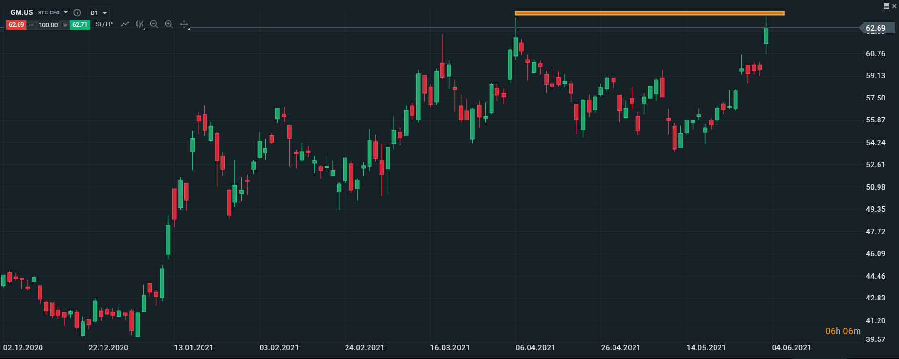 Akcie spoločnosti General Motors (GM.US) dnes zaznamenali prudký nárast o viac ako 5 percent a patria medzi najvýkonnejšie akcie zaradené v akciovom indexe US500. Cena akcií dnes testovala historické maximá okolo úrovne 63,50 USD, no časť ziskov už bola vymazaná. V prípade, ak by cena dokázala prekonať spomínanú úroveň, otvoril by sa priestor na rast ceny do nezmapovaných vôd, pričom ďalší odpor v rade predstavuje hladina 65 USD. Zdroj: xStation5