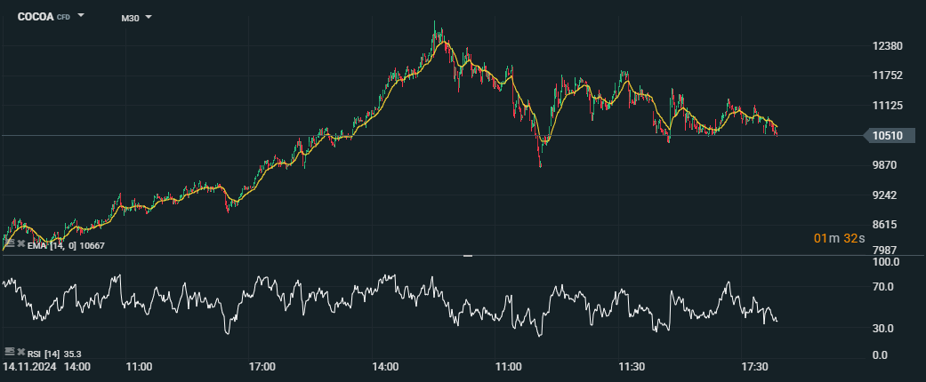 Vývoj ceny kakaa (COCOA CFD) na 30minutovém grafu s indikátory Exponenciální klouzavý průměr (EMA, perioda 14) a Index relativní síly (RSI, perioda 14). Cena kakaa klesla na úroveň 10 510 USD po dosažení maxima na úrovni 12 380 USD, zatímco RSI je na hodnotě 35,3, což signalizuje blízkost přeprodaného pásma. Zdroj: xStation5
