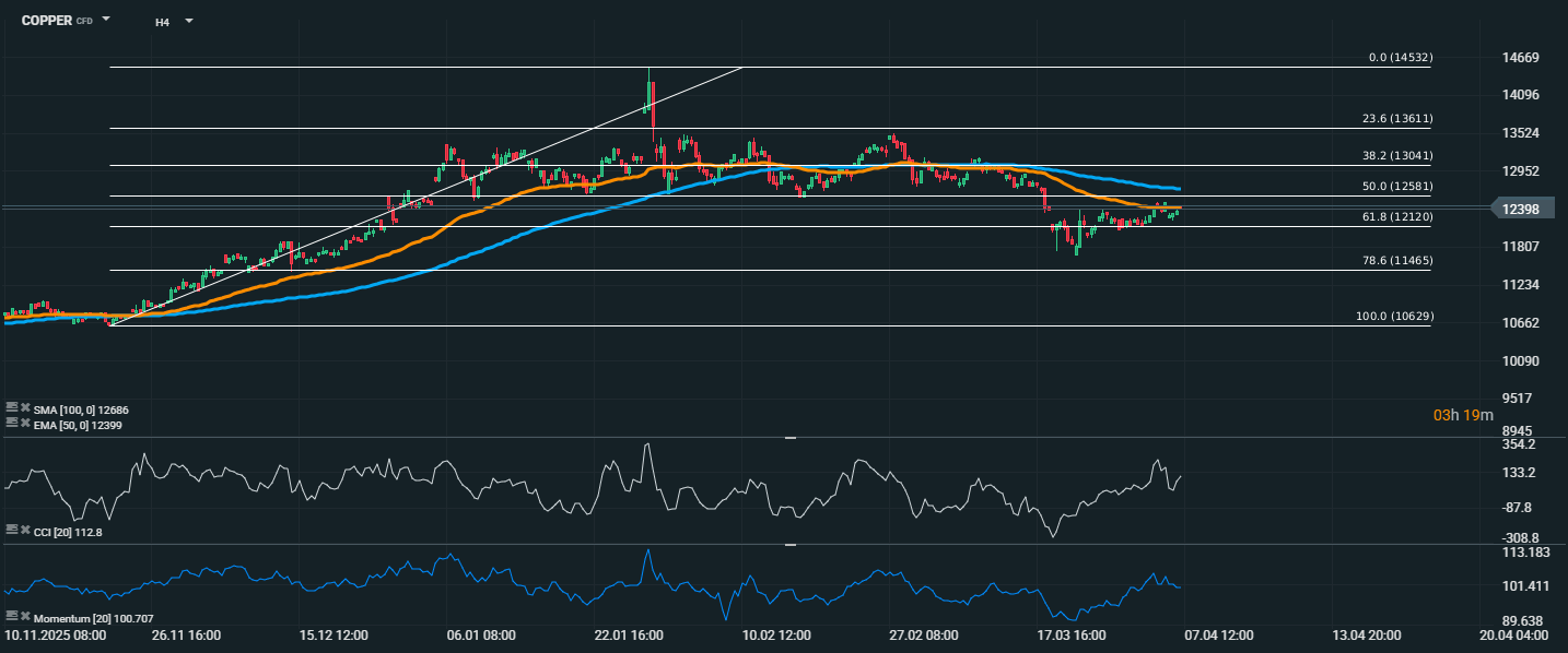 Cena mědi se aktuálně pohybuje kolem 12 398 USD a po předchozím poklesu se snaží stabilizovat nad důležitou Fibonacciho úrovní 61,8 % na 12 120 USD. Právě tato hladina nyní funguje jako nejbližší technická podpora, od které se trh v posledních seancích odrazil. Krátkodobě je pozitivní, že se cena drží těsně nad EMA 50 na 12 399 USD, což naznačuje snahu kupců vrátit do trhu alespoň část růstového momenta.