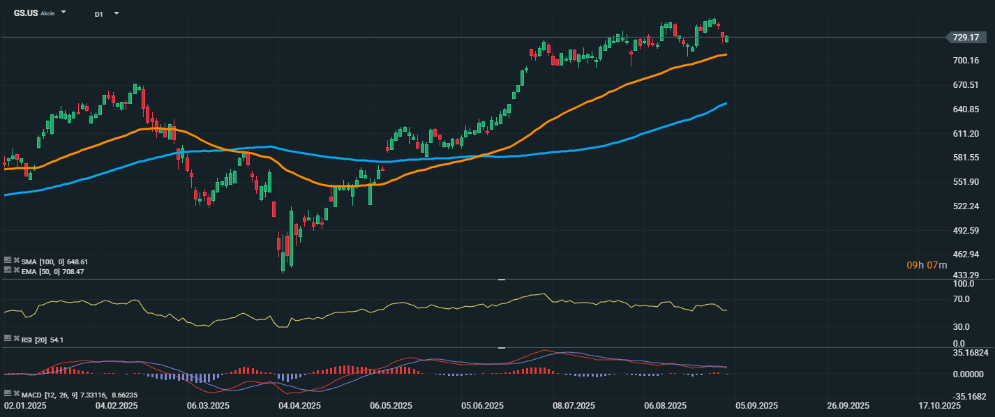 Akcie Goldman Sachs se aktuálně obchodují na ceně 729,17 USD a nadále se nacházejí ve stabilním růstovém trendu, který začal po obratu v březnu 2025. Cena se nyní drží výrazně nad klouzavými průměry EMA 50 (708,47 USD) a SMA 100 (648,61 USD), což potvrzuje silné býčí nastavení. RSI ukazuje na mírné ochlazení tempa růstu, ale zůstává v neutrálním pásmu a neposkytuje signál o překoupenosti. Mírné korekce z posledních dní mohou být interpretovány jako zdravá konsolidace po silném růstovém období.