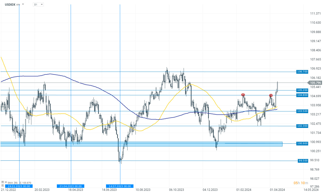 Obavy bankéřů Federálního rezervního systému se odrážejí také v nedávných silných ziscích dolaru. Katalyzátorem těchto nárůstů byly samozřejmě údaje o inflaci, které byly vyšší, než se očekávalo, což vedlo ke změně očekávání ohledně prvního snížení úrokových sazeb. Rostoucí geopolitické napětí navíc způsobuje odliv kapitálu z rizikových aktiv směrem ke zlatu i dolaru. V případě prvního jmenovaného jsme dnes svědky vysoké volatility. V případě dolaru pozorujeme tři seance dynamického růstu v řadě. USDIDX již překonal letošní maxima a blíží se k dvouletým maximům kolem 1,067.