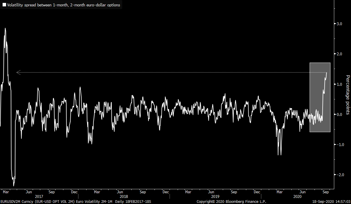 Graf ukazuje nárůst spreadu mezi měsíčními a dvouměsíčními opcemi na páru EURUSD. Rozšíření spreadu znamená rostoucí nejistotu investorů, která se dostala nejvýše od francouzských prezidentských voleb v roce 2017. Zdroj: Bloomberg