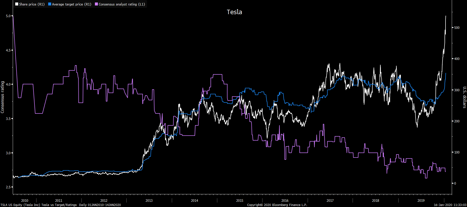 Akcie automobilky Tesla nepřestává udivovat investory. Její cena v tomto roce před včerejší korekcí už rostla o více než třetinu až na dosah úrovně 538 dolarů. Cena prudce povyrostla navzdory dlouhodobému poklesu doporučení analytiků oslovených agenturou Bloomberg, který aktuálně dosáhl na 2,67 bodů (1 sell, 5 buy). Z 36 oslovených analytiků v posledním roce doporučilo nákup pouze 10 z nich. Dalších 10 doporučilo akcii držet a většina šestnácti analytiků se vyslovila pro prodej akcie. Navíc dvanáctiměsíční cílová cena se i přes prudký růst v posledních týdnech vyšplhala zatím jen na 358 dolarů. Na poslední nárůst ceny už reagují velké investiční banky. Morgan Stanley dnes přišla poprvé za posledních 7 let s doporučením akcie prodat. Tato zpráva byla na čele faktorů, které dnes po otevření poslaly akcie automobilky do červených čísel.