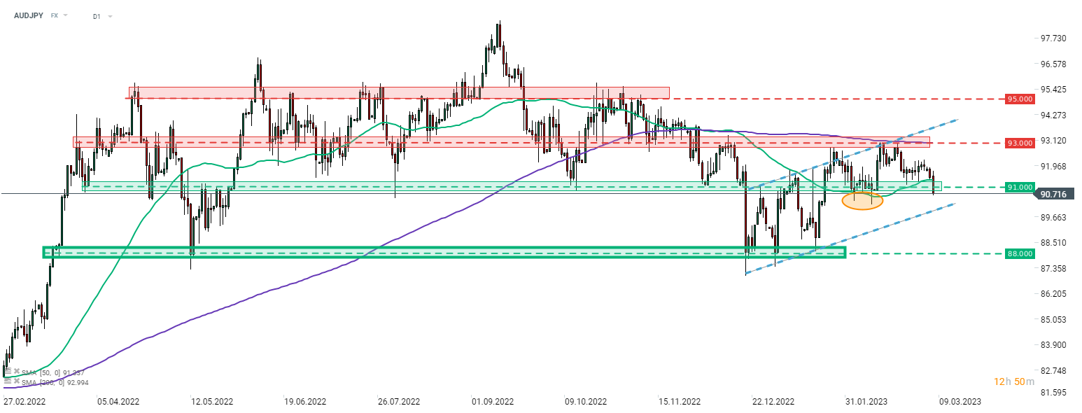 Když se podíváme na graf AUDJPY v intervalu D1, můžeme vidět, že pár dnes proráží pod zónou supportu na úrovni 91,00. Obchodníci by však měli mít na paměti, že to není poprvé, kdy se pár pokouší prorazit pod support 91,00 – dva nedávné pokusy se ukázaly jako neúspěšné (oranžový kruh). Pokud by byl probíhající pokus úspěšný, další potenciální podporu lze nalézt v oblasti 90,10, kde aktuálně běží spodní hranice vzestupného kanálu.