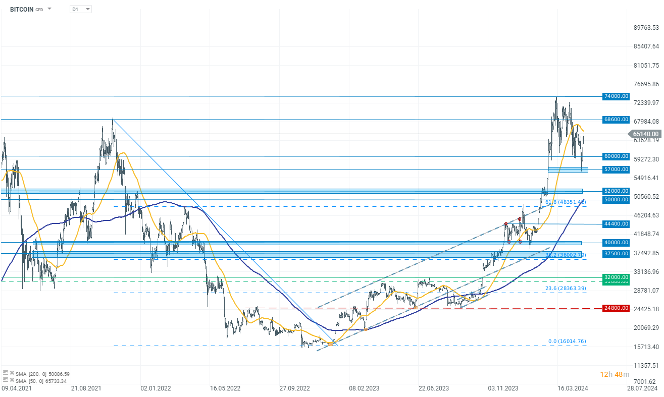 Bitcoin se odrazil kolem úrovně 57 000 USD, což je prahová hodnota pro krátkodobé investory. Tyto úrovně se opět ukázaly jako účinná podpora během uptrendu. Dokud však Bitcoin rozhodně neprolomí historické ATH, nemůžeme mluvit o návratu k uptrendu. V tuto chvíli stále zůstáváme ve fázi konsolidace, která může trvat ještě několik týdnů. Nejdůležitějšími úrovněmi, které je třeba sledovat, jsou úroveň podpory na 57 000 USD a rezistence kolem 71 500 až 73 000 USD.