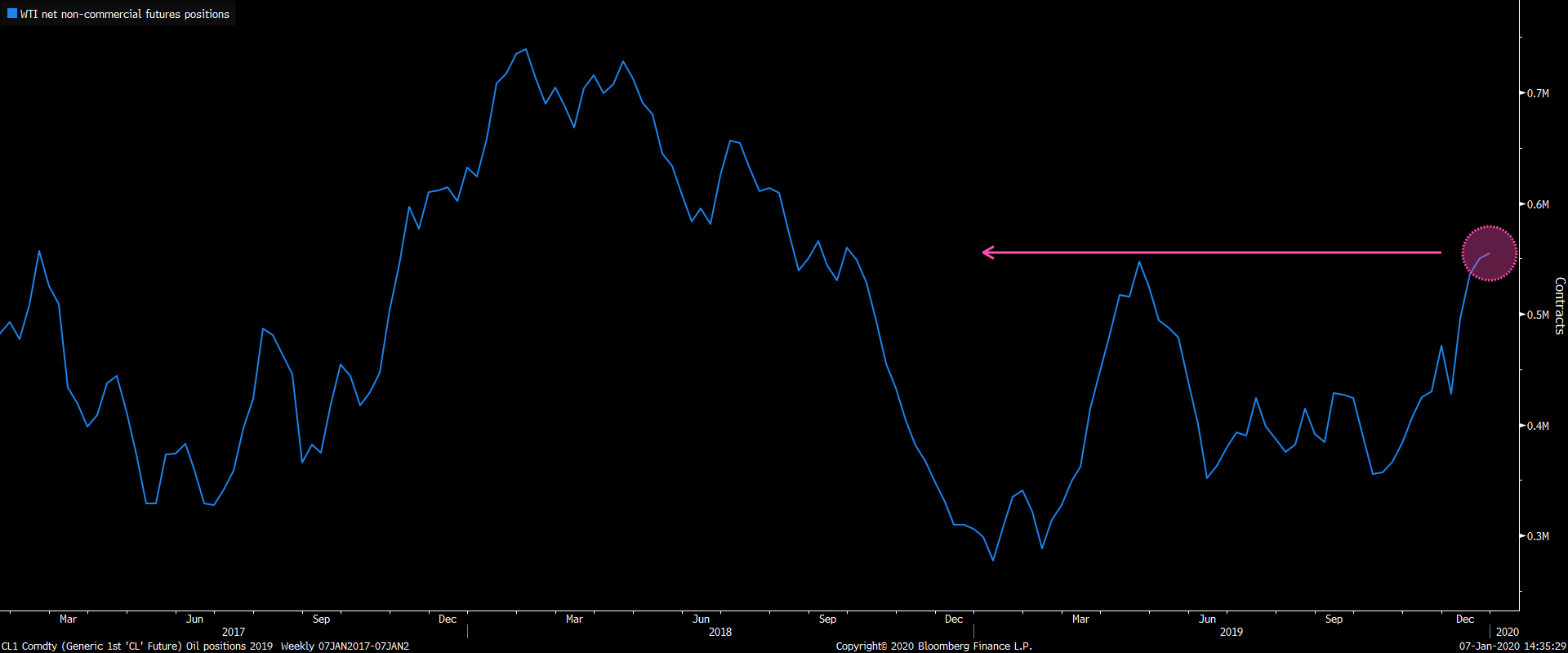 K dobrému výsledku obchodu na finančních trzích stačí někdy správná analýza, jindy štěstí, ovšem k těm nejlepším obchodům vede často kombinace obojího. Něco takového se podařilo velkým obchodníkům na ropě, kteří už od počátku října navyšovali net-long pozice na této komoditě. Dokázali tak profitovat na pozitivním globálním ekonomickém vývoji. Navíc v prosinci kromě dohody mezi USA a Čínou zasedal OPEC, který snížil stanovené produkční kvóty. Zabití íránského generála na počátku nového roku pak přispělo k dalšímu výraznému vzestupu cen. Americká ropa WTI se od počátku října zhodnotila o pětinu do konce roku a v reakci na zvýšení napětí na Blízkém a Středním východě se na počátku týdne cena přiblížila dokonce 65 dolarům za barel. Graf ukazuje nárůst spekulativních pozic velkých obchodníků na ropě až na patnáctiměsíční maxima na 555 tisíc kontraktů v závěru roku 2019.