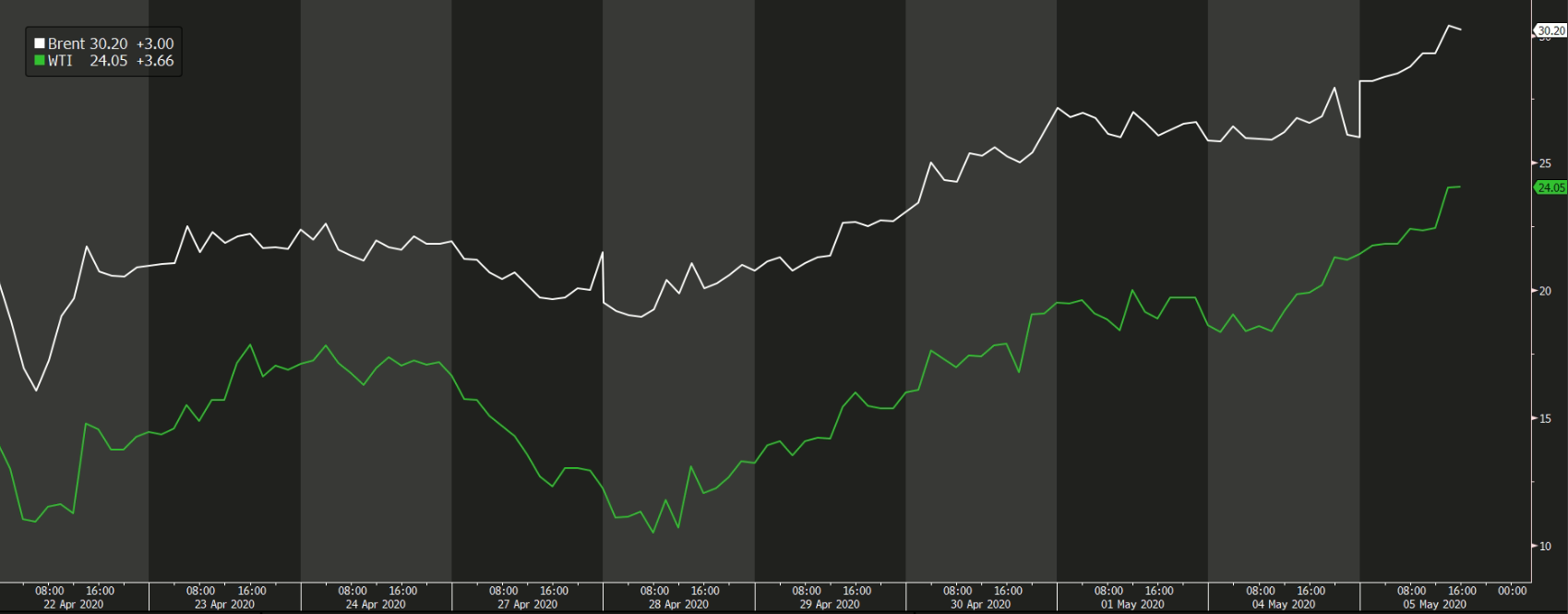 Cena ropných benchmarků Brent i WTI se už od konce dubna pohybuje v lokálním rostoucím trendu. Cena Brentu dnes překonala 30 dolarů za barel. Na této úrovni se naposledy nacházena 15. dubna. Zdroj: Bloomberg