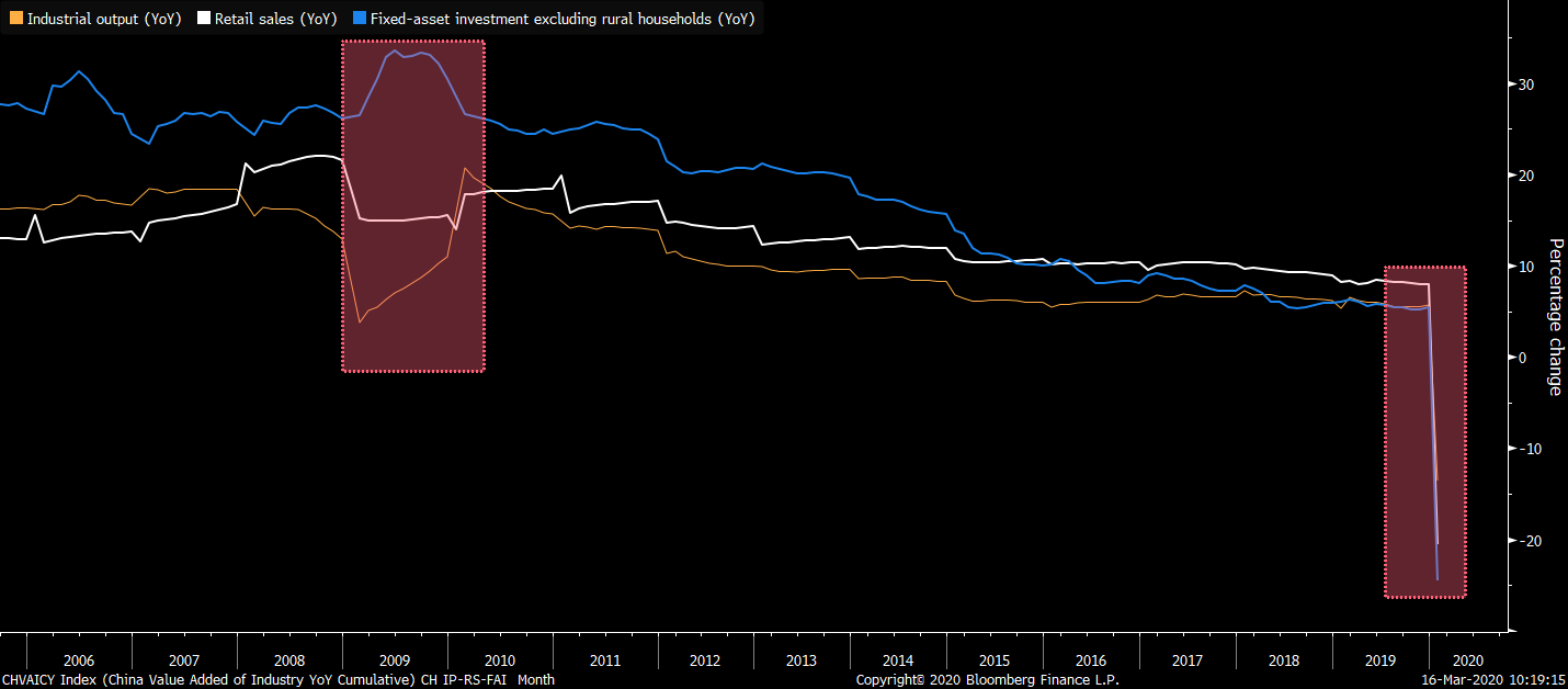 Přicházející data ukazují na výrazný propad čínské ekonomiky. Šíření koronaviru zavřelo továrny, obchody, restaurace a další podniky. Dnešní statistiky průmyslové produkce za leden-únor ukázaly propad o 13,5 % (samotná data za leden nebyla zveřejněna). Investice do fixních aktiv klesly o 24,5 % a maloobchodní prodeje ztratily 20,5 %. Pokles důležitých ekonomických indikátorů se udál i přes aktivitu čínské centrální banky, která naposledy v pátek snížením rezerv poskytla bankám více likvidity, které mohou být prostřednictvím úvěrů pumpovány do ekonomiky. Nabízí se srovnání s děním během poslední finanční krize, která skončila před 10 lety. Tehdy se sledované makro vůbec nedostalo do negativního teritoria. Průmyslová produkce a maloobchodní prodeje pouze zpomalily a naopak díky stimulům výrazně stouply investice do fixních aktiv.