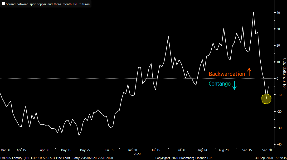 Dlouhé měsíce byli na trhu s mědí více aktivní býci. Kromě růstu ceny se tento stav projevoval na forwardové křivce, kde byly aktuální kontrakty dražší než kontrakty budoucí. Trh byl tedy ve stavu backwardation, který obvykle značí aktuální „hlad“ po instrumentu (nebo aktuální problémy na straně nabídky). Situace se však v druhé polovině září rychle otočila. Až 40 dolarový spread mezi spotem a tříměsíčním forwardem ve prospěch spotové ceny se během necelých dvou týdnů dostal na více než 10 dolarový spread ve prospěch 3M forwardu. Trh se tak rychle dostal do tzv. contanga, které je odrazem ochabující čínské poptávky. Dle posledních dat navíc zásoby monitorované londýnskou komoditní burzou vzrostly na nejvyšší úroveň od května.
