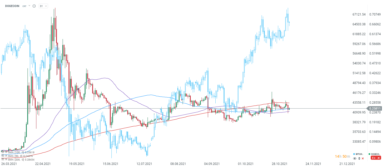 DOGECOIN se v poslední době obchoduje v úzkém rozpětí. I přes prudký růst Bitcoinu od září má mnoho dalších altcoinů problém růstu následovat. A mezi ně patří také Dogecoin, kterému se nedaří prorazit úroveň 0,30. Kryptoměna se v posledních týdnech obchoduje mezi 50 a 200 SMA. Úroveň 200 SMA (červená čára) je stěžejní, protože v historii sloužila jako důležitý support.