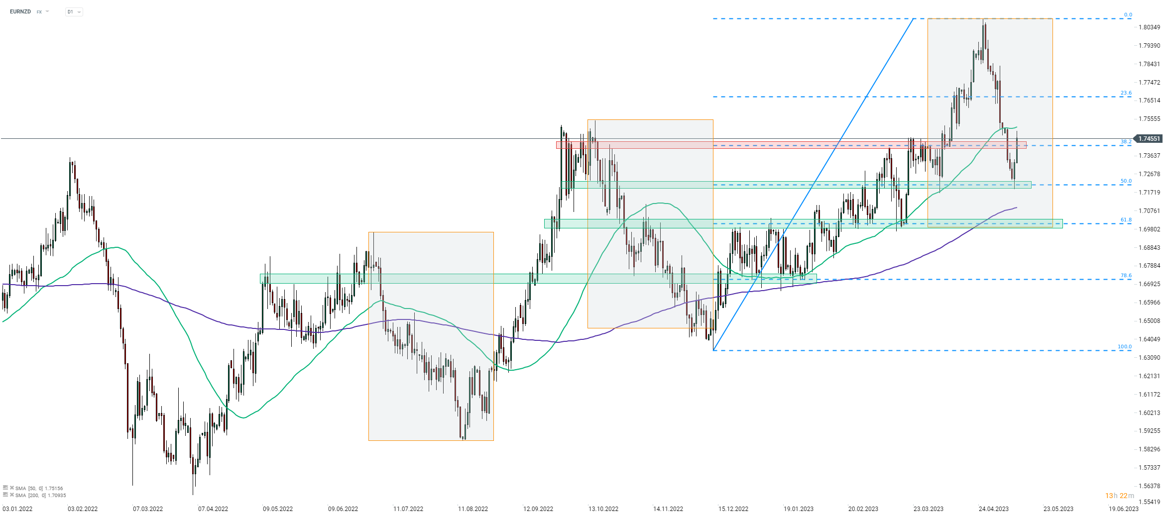 Když se podíváme na graf EURNZD v intervalu D1, můžeme vidět, že pár zastavil nedávný výprodej při 50% retracementu vzestupného impulsu zahájeného v polovině prosince 2022. Oživení bylo zahájeno včera a zisky se zrychlily dnes. Pár se vyšplhal nad zónu odporu v oblasti 1,7420, která je označena 38,2% retracementem a očekává test klouzavého průměru 50 sezení (zelená čára).