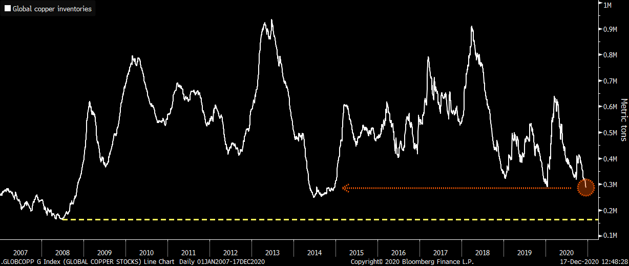 Zásoby mědi prudce klesají. Dostaly se na nejnižší úroveň od roku 2014 a brzy se mohou dostat na nejnižší úrovně od roku 2008. Zdroj: Bloomberg
