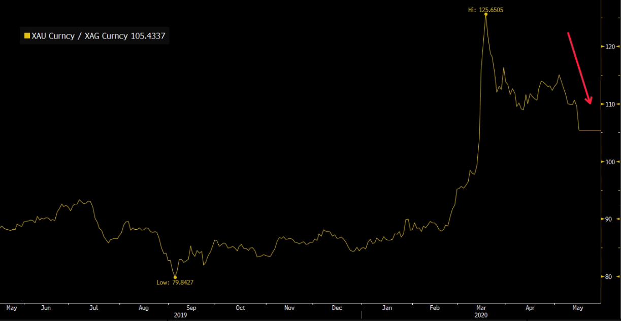 Poměr cen zlata a stříbra dnes klesl na nejnižší úrovně za poslední 2 měsíce. Obchodníci považují ceny stříbra v poměru ke zlatu za podhodnocené a více nakupují levnější kov. Zdroj: Bloomberg