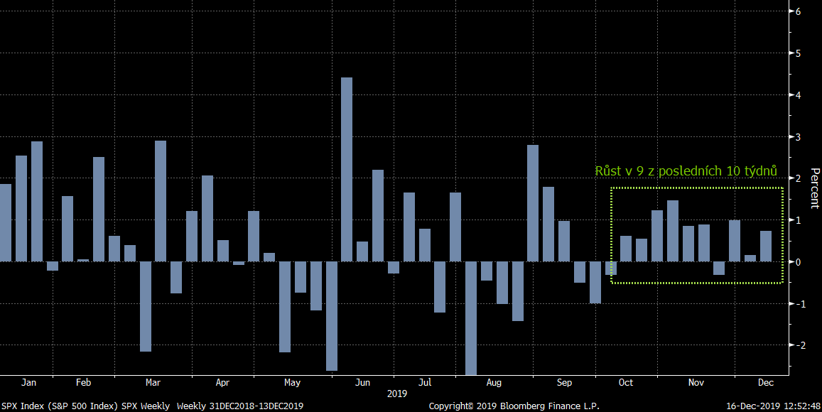 Akciovým trhům se v poslední době dařilo a na sklonku minulého týdne dostaly nový pozitivní impuls ve formě schválení obchodní dohody USA s Čínou. Wall street tak opět navýšila historické úrovně. Index S&P 500 vyrostl v minulém týdnu o 0,73 % na 3168,8 bodů. Jednalo se už o devátý růst z posledních deseti týdnů. Od počátku této růstové vlny vzrostl index o 6,2 % a od začátku roku jsme svědky výjimečného růstu o 26,8 %. Akciím v průběhu roku pomáhaly dobré finanční výsledky společností. Přestože se dlouhou dobu přetřásalo globální ekonomické zpomalení, tak negativní dopad na akciovém trhu nebyl výrazný. Jedním důvodů je expanzivní měnová politika hlavních světových centrálních bank.