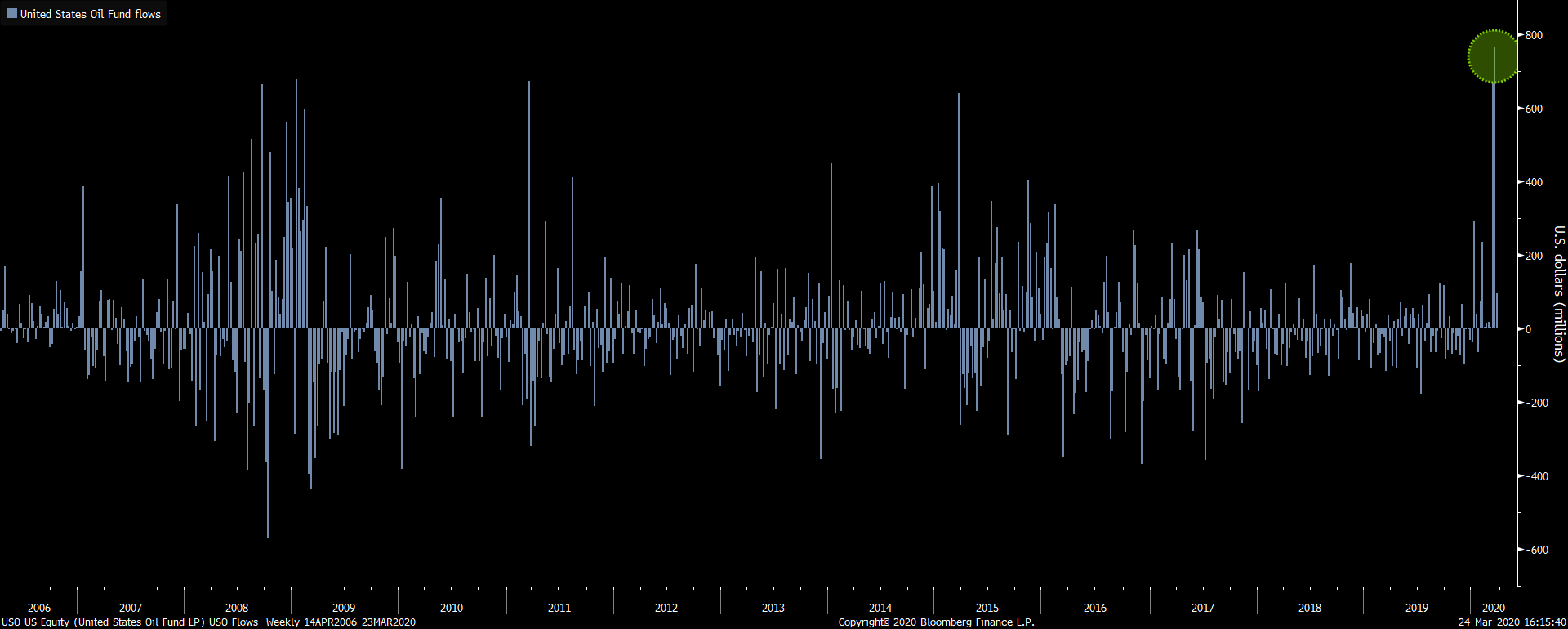 Investoři nalili v minulém týdnu masivní objem hotovosti do amerického ETF fondu, jehož hodnota se odvíjí od vývoje ceny ropy na trzích. Napumpovali do něj dle dat Bloombergu rekordních 765 mil. dolarů. Podobného přílivu investic se fond dočkal naposledy v roce 2015. Cena ropy WTI se v minulém týdnu přiblížila úrovni 20 USD/bbl, přitom ještě před měsícem se pohybovala nad 50 USD/bbl. Dnes se cena WTI pohybuje v blízkosti 24 USD/bbl. Propad cen ropy je důsledkem neschválení dohody mezi Saúdskou Arábií (OPEC) a Ruskem o pokračování těžebních kvót. Na straně poptávky se pak projevuje výrazné zpomalení ekonomické aktivity v souvislosti s globálním šířením koronaviru. Extrémní příliv hotovosti do ETF ropného fondu napovídá, že nemalá část trhu sází na vzestup cen ropy. Je už cenové dno na ropě za námi?