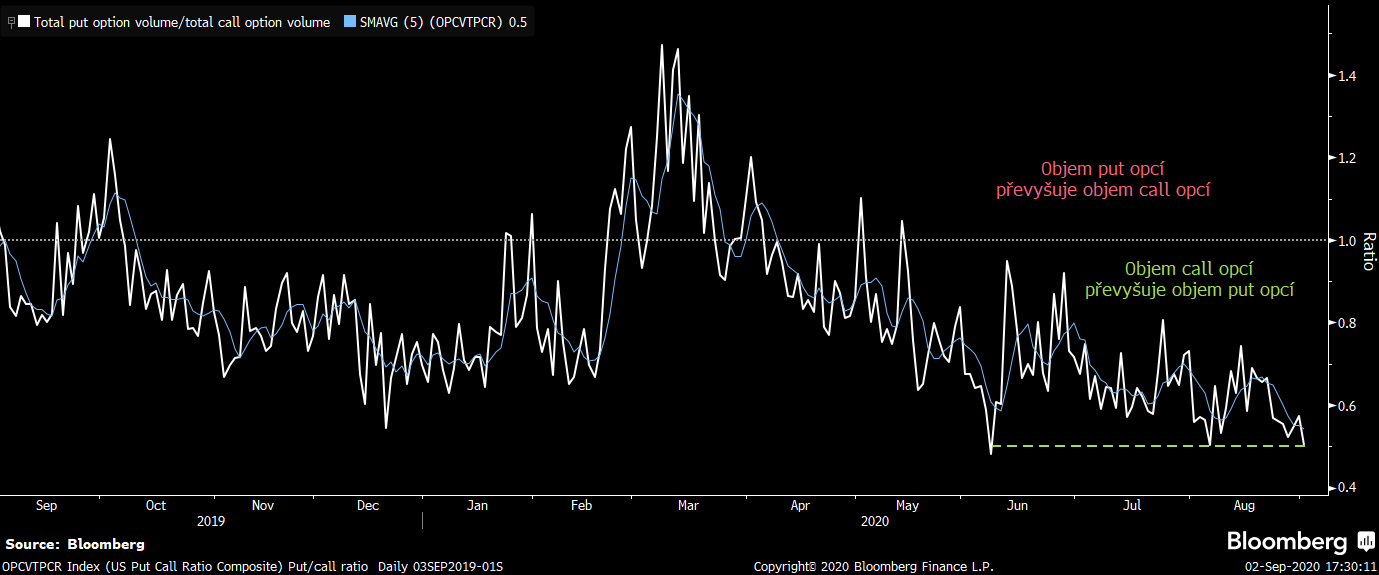 Investoři na opčním trhu zvyšují sázky na nárůst amerických akcií. Poměr put/call opcí obchodovaných na amerických trzích klesl v úterý na 0,5 a pětidenní průměr se dostal na 0,54. Jedná se o nejnižší úroveň průměru tohoto poměru od roku 2010. Rostoucí poptávka po call opcích naznačuje, že se investoři ženou za rally na akciových trzích, které se pohybují na dosah historických rekordů. Opce dává kupujícímu právo koupit (call opce) nebo prodat (put opce) podkladové aktivum za předem stanovenou cenu do určitého data.