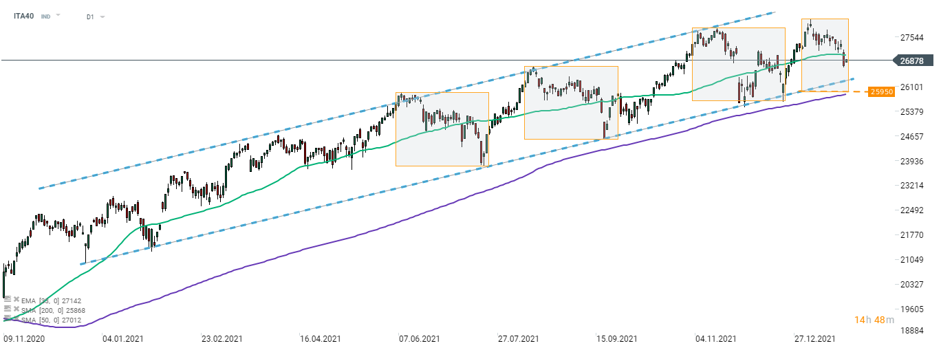 Na hlavním italském indexu FTSE MIB (ITA40) vidíme, že se index pohybuje v rostoucím kanálu už od listopadu 2020. Na indexu proběhlo v posledním roce několik korekcí (stejné velikosti), takže spodní limita tržní geometrie na úrovni 25 950 bodů je vnímána jako klíčový support. V jeho blízkosti se navíc nachází 200 období klouzavý průměr (fialová čára). Aby se však ITA40 na tuto úroveň dostal, tak nejdříve musí prorazit pod spodní limitu kanálu. Index se na počátku týdne obchoduje mírně nad touto úrovní v pozitivním trendu, ale pohyb zatím příliš malý, abychom mohli mluvit o výraznější korekci.