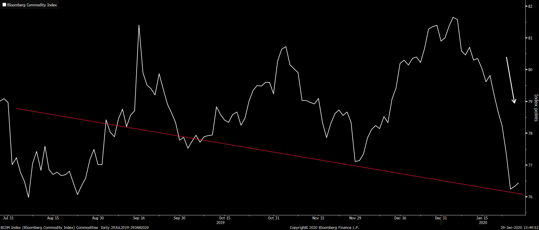 Bloomberg komoditní index propadl ze svých letošních maxim o 6,5 % na nejnižší úrovně od srpna 2019. Nedaří se hlavně průmyslovým kovům a energiím. Hlavním důvodem je strach z koronaviru, ale průmyslové komodity sráží také problémy výrobního sektoru. Zdroj: Bloomberg