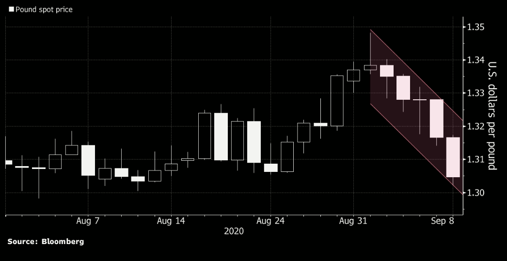 Libra ztratila na páru s USD v posledních seancích stovky pips. Hlavním důvodem je zatím neúspěšné vyjednávání o Brexitu. Zdroj: Bloomberg