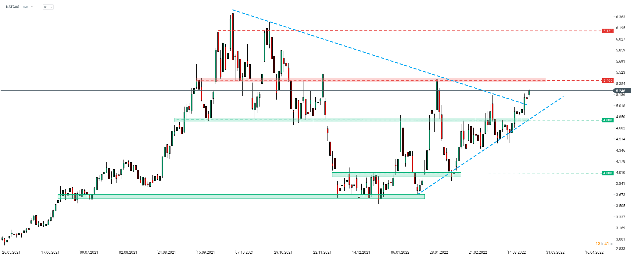 To by však mohla být šance pro americký zemní plyn (NATGAS na xStation). Spojené státy plánují pomoci EU snížit její závislost na ruských komoditách a oznámení o zvýšení dodávek amerického LNG do Evropy může být oznámeno již zítra. Ceny zemního plynu v USA v poslední době také rostly, ale rozsah nárůstu nebyl tak velký jako v případě evropských cen.