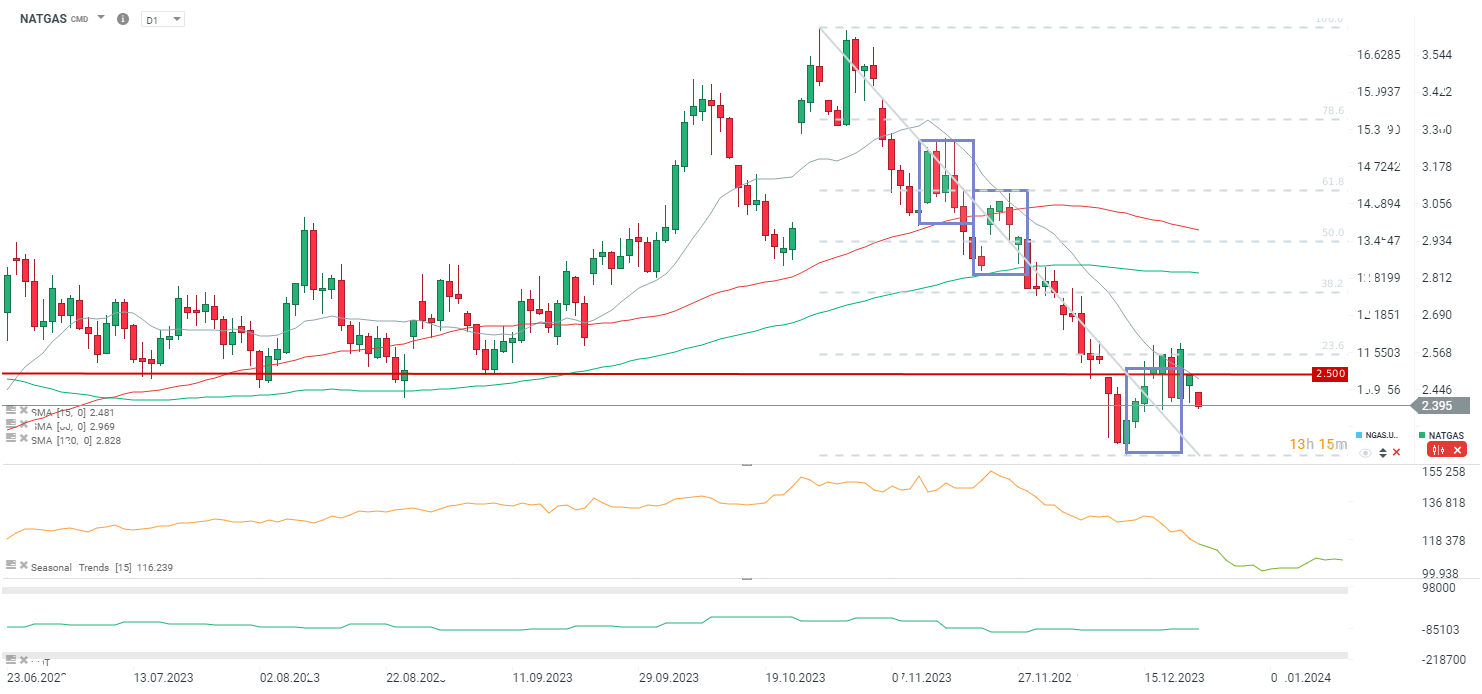 NATGAS dnes ráno zažívá výrazný pokles o více než 3 %, čímž do značné míry vymazal odraz, ke kterému došlo v předchozích dvou seancích (je pozoruhodné, že převrácení mezi 21. a 22. prosincem bylo negativní). Cena výrazně klesá navzdory tomu, že se objevily nové předpovědi počasí ve Spojených státech, které naznačují znatelný trend ochlazování v nadcházejících týdnech. Na druhou stranu vánoční období bylo jedním z nejteplejších v historii, což potenciálně naznačuje sníženou spotřebu zemního plynu v posledních dnech. Ve čtvrtek se dočkáme údajů o zásobách zemního plynu. Předchozí údaje ukázaly snížení o 87 mld. kubických stop. Pokles zásob v rozmezí 50-80 mld. kubických stop by byl pro ceny zemního plynu negativní. V minulých letech však v tomto období roku došlo ke snížení o 100-200 bcf, což způsobilo oživení cen. Současně je při takto zvýšených teplotách náročné očekávat tak výrazný pokles zásob. Sezónnost stále ukazuje na poklesy po zbytek letošního roku. Nejbližší úrovní podpory je 2,38, což je lokální minimum z 19. prosince.
