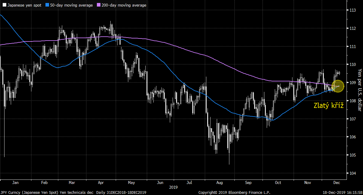 Japonská měna nemá v současnosti jako známý bezpečný přístav na růžích ustláno. Trhy procházejí silnými růsty a prim hrají riziková aktiva. Japonský jen oslabuje na páru s americkým dolarem už od srpna, kdy pár USDJPY vytvořil letošní minima pod 105 jeny za dolar. Následný růst dostal pár ke konci roku až do blízkosti úrovně 110 jenů za dolar. Obrat trendu znamenal následně také obrat 50denního klouzavého průměru směrem k vyšším úrovním a zároveň zpomalení poklesu 200denního průměru. V úterý došlo k protnutí těchto průměrů, čemuž se v rámci terminologie technické analýzy říká zlatý kříž. Jedná se o technickou formaci, která je považována za nákupní signál. Za poslední měsíc byl JPY jedinou měnou z G10, která na páru s USD zaznamenala ztrátu.