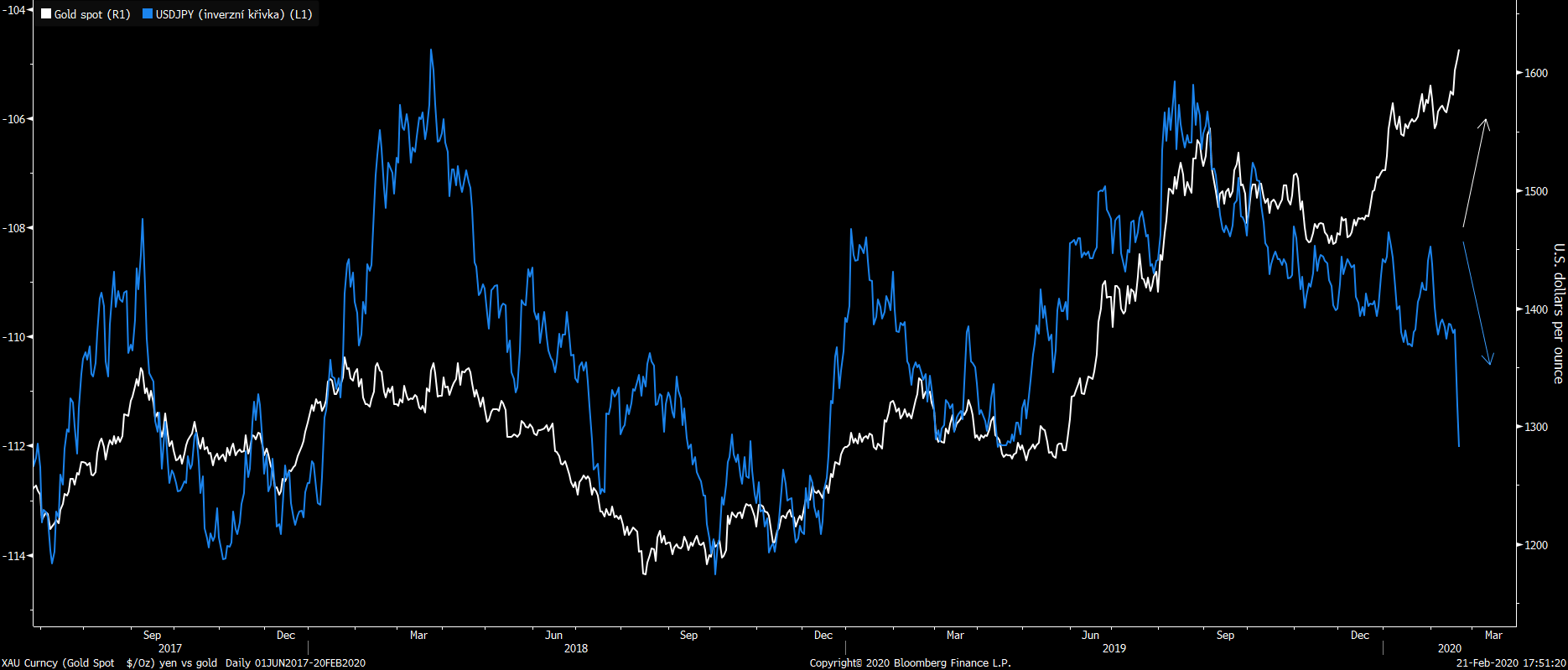 Pozitivní vztah mezi tradičními bezpečnými přístavy japonským jenem a zlatem se letos rozplynul jako pára nad hrncem. Zlato v tomto roce přidalo už více než 7 % a dnes opět navýšilo sedmiletá maxima. Přiblížilo se už na dosah úrovně 1650 dolarů za unci. Naopak japonský jen v posledních seancích výrazně ztrácel a v tomto roce už na páru s USD přišel o 3 %. Pár USDJPY překročil v tomto týdnu úroveň 112 jenů za dolar, kde se naposledy pohyboval téměř před rokem. Zatímco zlato hraje stále tradiční roli bezpečného instrumentu a zajištění v časech zvýšené nejistoty, tak japonský jen trápí stav domácí ekonomiky a riziko rozšíření koronaviru, který by mohl výrazně poškodit tamní ekonomiku. Zlato začalo mít naopak pozitivní korelaci s USD. Poprvé od roku 2016 se jejich 40-denní korelační koeficient dostal do kladného teritoria.