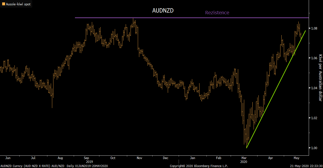 Pokračování rally australského dolaru na páru s novozélandským dolarem vypadá křehce. Z fundamentálního pohledu hraje role napětí mezi světovými mocnostmi - USA a Čínou, které by mohlo zvýšit rizikovou averzi. Pro Austrálii je Čína nejvýznamnějším obchodním partnerem. V minulém roce tam mířila takřka třetina veškerého exportu. Také z technického pohledu to vypadá, že rally míří ke svému konci. Z březnových minim se pár už dočkal růstu o 7 % a přiblížil se rezistenci v blízkosti listopadového maxima. Pomalý Stochastics se vydává medvědím směrem a MACD nevytvořil nové maximum. Novozélandská centrální banka v nedávné minulosti spekulovala o zavedení negativních úrokových sazeb, nicméně ve středu se guvernér RBNZ Adrian Orr vyjádřil, že o jejich zavedení v současnosti neuvažuje. Hlavní sazba RBNZ se nachází na 0,25 % a hlavní sazbu ve stejné výši drží také australská RBA.