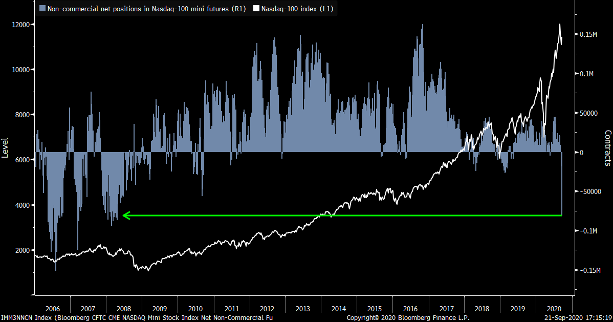 Graf ukazuje masivní pokles net-pozic na technologickém Nasdaq-100 mini za poslední týden. Spekulace na pokles jsou nyní nejvyšší od roku 2008. Zdroj: Bloomberg