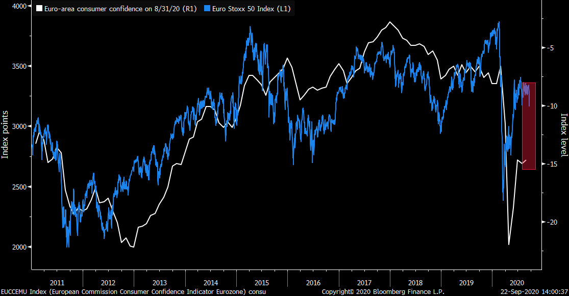 Pondělní výprodej příliš nepomohl uzavřít rozdíl mezi vývojem spotřebitelské důvěry v eurozóně z pera Evropské komise a akciovým indexem Euro Stoxx 50 (EU50). Spotřebitelská důvěra se na jaře propadla na nejnižší úrovně od roku 2012 a od té doby došlo pouze k určitému zlepšení. Sentiment tak výrazně zaostal za vývojem evropských akcií. I když ani indexu Euro Stoxx 50 se zatím nepodařilo vymazat pandemický propad. Dnešní úrovně se nachází téměř pětinu pod únorovými maximy. Jedná se o přibližně dvojnásobnou ztrátu, než kterou ke dnešnímu dni vykazuje německý DAX 30. Nová data spotřebitelské důvěry v eurozóně za září budou zveřejněna v úterý v 16:00. Očekává se stagnace na -15 bodech.
