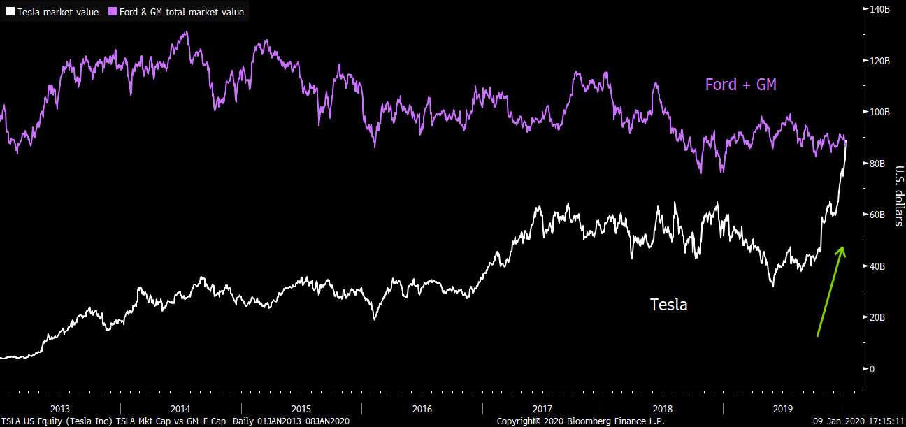 Automobilka Tesla si prochází extrémně úspěšným obdobím. Její akcie posílily v průběhu prosince o 27 % a od začátku roku přidávají dalších 17 % k úrovni 490 dolarů. Její tržní kapitalizace vzrostla na 88,7 miliard dolarů a překonala tak dvě největší americké automobilky (dle počtu vyrobených aut) Ford a General Motors, jejichž tržní kapitalizace dosáhla na pouze 88,2 miliardy dolarů. Z červnových minim už tržní kapitalizace Tesly vzrostla o 175 %. K růstu akcií automobilky pomáhají velmi dobré hospodářské výsledky za Q3 a také rozjezd produkce v nové čínské továrně.