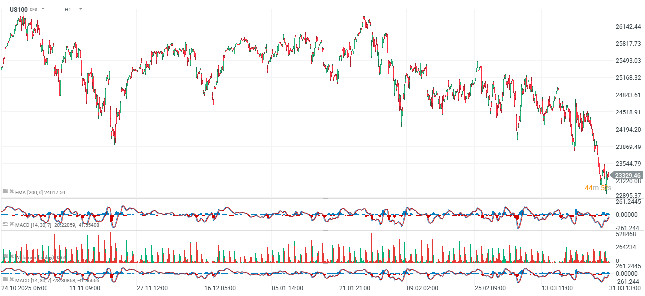 Při pohledu na graf US100 je zřejmé, že v posledních několika desítkách hodin převládal prodejní tlak. Když tento pohyb porovnáme s předchozími impulzy podobného rozsahu, každý z nich vedl alespoň ke krátkodobému V-shaped rebound. Pokud by se tento scénář zopakoval, US100 by mohl vzrůst směrem k úrovni 24 000, než by čelil vážnějšímu testu býčího momenta. Zároveň však zůstává volatilita zvýšená a Wall Street je stále velmi citlivá na vývoj v regionu, kde je známek deeskalace jen málo. Izraelská armáda uvedla, že je připravena pokračovat v operacích ještě mnoho týdnů, zatímco premiér Benjamin Netanjahu zdůraznil, že pro další údery neexistuje žádný „časový limit“.