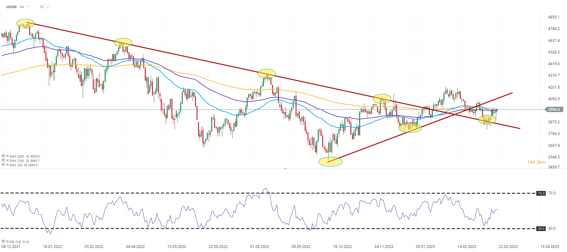 Jak můžeme vidět na níže přiloženém grafu US500 na intervalu D1, cena se již téměř 2 roky pohybuje ve velmi zajímavé technické struktuře. US500 roste nad dlouhodobou sestupnou trendovou linií a úspěšně ubránila linii, což povzbudilo býky k vzestupu. Neúprosně se však blížíme k dalšímu omezení, a to rezistenci nastolené vzestupným trendem zahájeným v posledním čtvrtletí roku 2022.