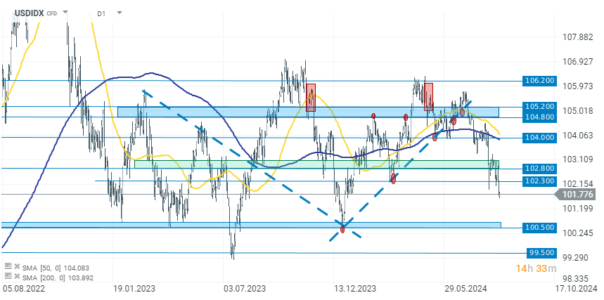 Nicméně začátek cyklu snižování sazeb v USA se neodvratně blíží, což by mělo podpořit pokračování klesajícího trendu. Na konci roku 2023 bylo na základě spekulací na snížení sazeb vytvořeno lokální minimum poblíž 100,5000. V současné době je zahájení skutečného cyklu uvolňování sazeb v září velmi pravděpodobné a během následujících dvou zasedání téměř jisté. Šance na prolomení téměř dvouletého konsolidačního kanálu na USDIDX jsou proto nyní vyšší.