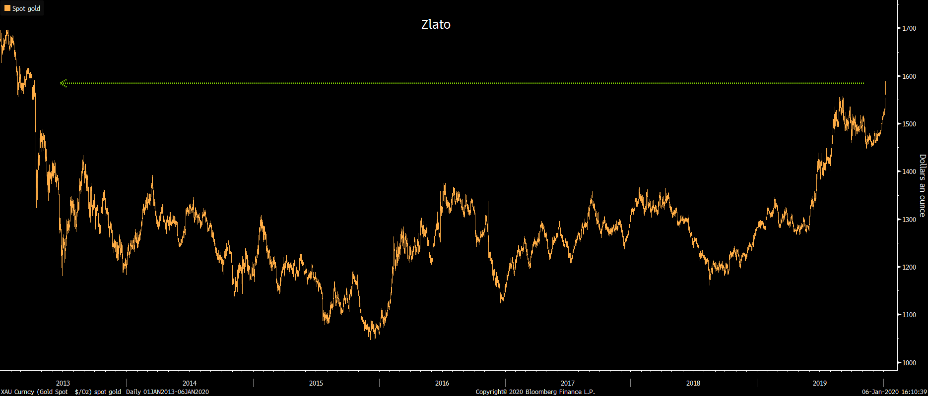 Zlato si v posledních seancích prochází prudkým růstem. Po pátečním zabití íránského generála Kásema Solejmáního prudce stoupla riziková averze na finančních trzích. Zlato v reakci vzrostlo o více než 50 dolarů až na hladinu 1580 dolarů za unci. Jedná se o nejvyšší úroveň od dubna 2013. Zlato otevřelo nový týden gapem po víkendové eskalaci napětí. Teherán oznámil, že se nadále nebude držet podmínkami jaderné dohody z roku 2015. Žlutý kov neměl v posledních letech na růžích ustláno. Po dosažení historických maxim v blízkosti úrovně 1920 dolarů za unci v roce 2011 dlouhodobě ztrácel a poslední roky mu přinesly pouze umírněný růst. Zlato se až do poloviny prosince nacházelo ve střednědobém klesajícím trendu. Investoři se zbavovali bezpečných přístavů kvůli lepšímu ekonomickému vývoji a naději na zklidnění situace ve světovém obchodu.