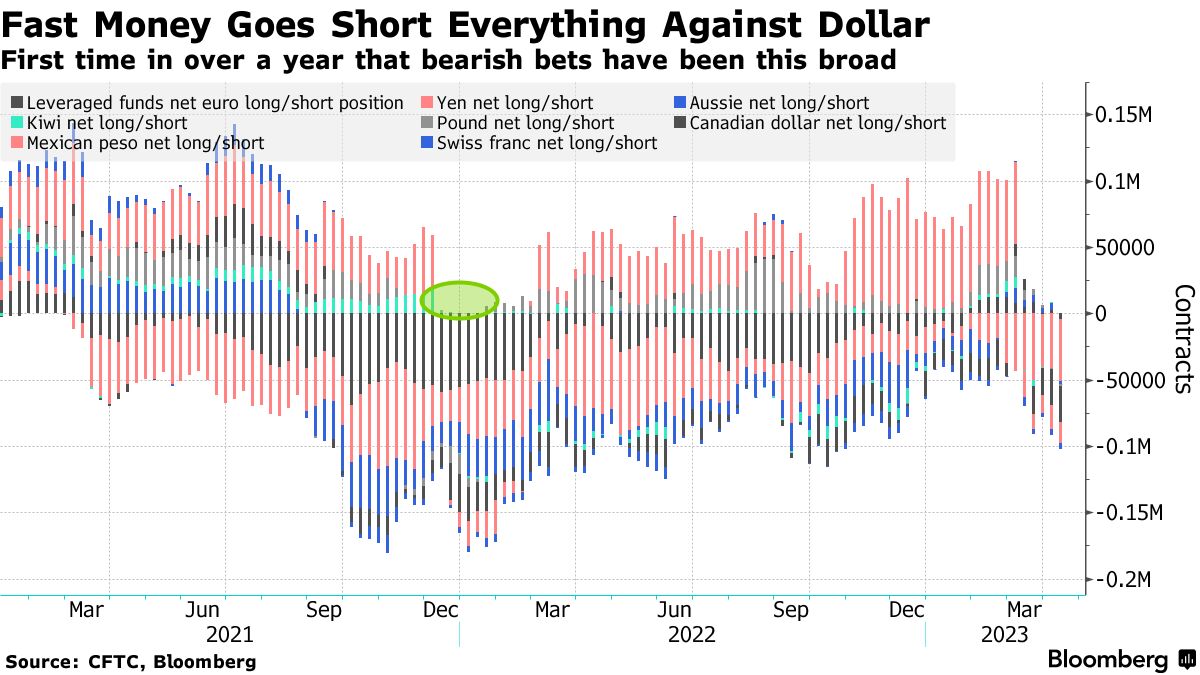 Agentura Bloomberg při analýze údajů z CFTC uvádí, že hedgeové fondy se vrhly na nákup dolaru. Poprvé za více než rok (od ledna 2022) fondy vůči americkému dolaru čistě neprodávají. Samozřejmě při širším pohledu napříč spektrem investorů je nálada na trhu vůči dolaru stále negativní, ale hedgeové fondy v posledních týdnech výrazně změnily názor.