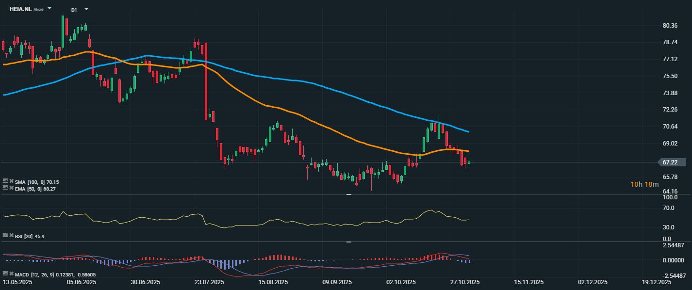 Akcie společnosti Heineken se aktuálně obchodují kolem úrovně 67,22 EUR, přičemž se nacházejí pod oběma hlavními klouzavými průměry – EMA 50 (68,27 EUR) i SMA 100 (70,15 EUR). Tato technická situace naznačuje pokračující medvědí trend, který byl potvrzen po neúspěšném pokusu o návrat nad 50denní klouzavý průměr. RSI se nachází na hodnotě 45,9, což ukazuje na slabé momentum bez přeprodaného stavu, ale zároveň bez náznaku zvratu směrem vzhůru.