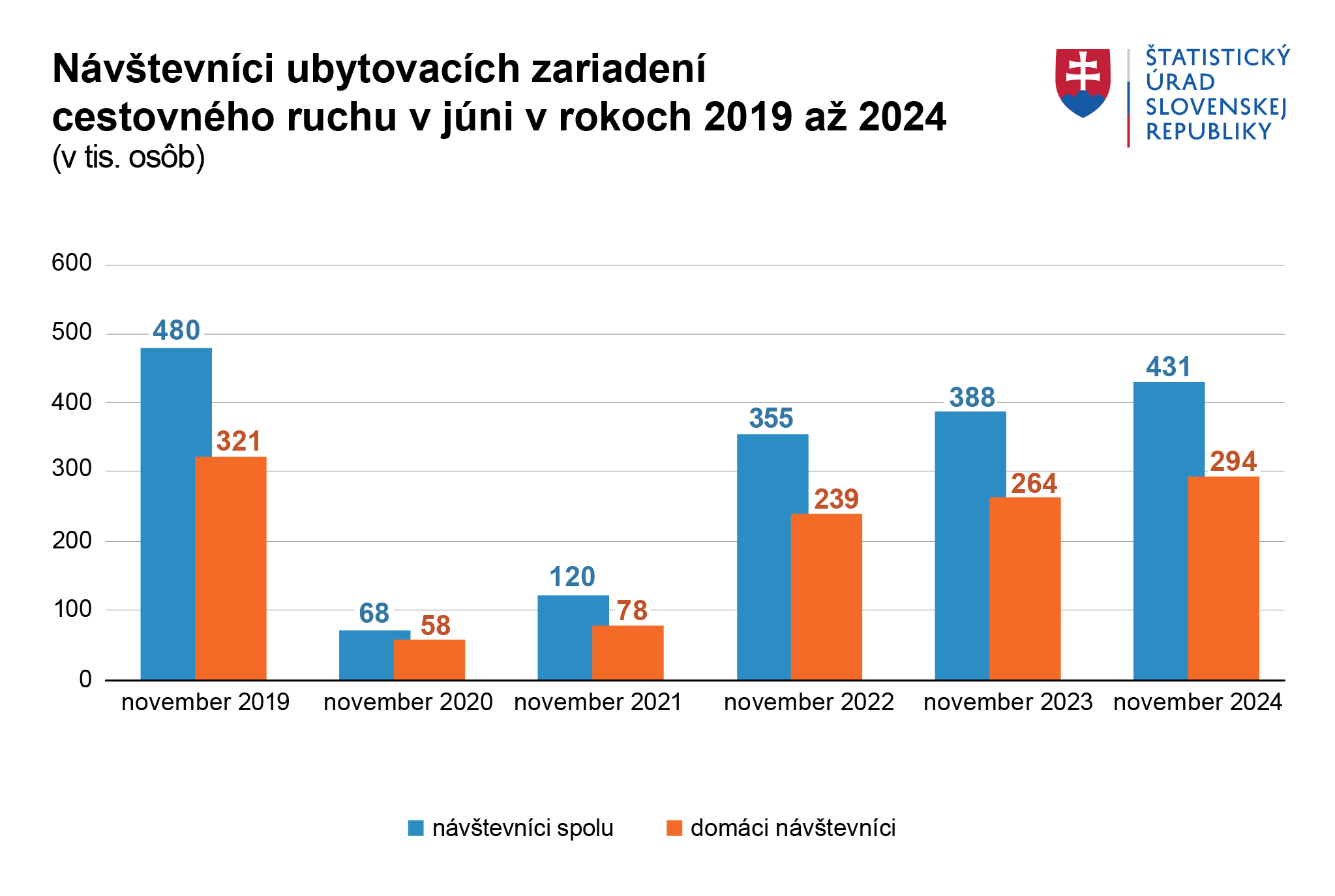 V listopadu 2024 navštívilo slovenské hotely a penziony 431 tisíc hostů, což představuje meziroční nárůst o 11,2 %. Přesto nebylo dosaženo rekordního počtu návštěvníků z listopadu 2019, který byl o 10 % vyšší. Tento výsledek však znamenal druhou nejvyšší listopadovou návštěvnost v historii.