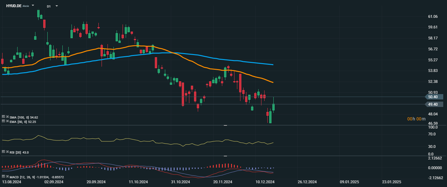 Akcie společnosti Hyundai Motor se obchodují na úrovni 50,40 EUR, což značí mírný růstový odraz po předchozím klesajícím trendu. Cena se však nadále nachází pod klouzavými průměry – EMA 50 (52,25 EUR) a SMA 100 (54,62 EUR), což potvrzuje, že celkové tržní nastavení zůstává medvědí. RSI se pohybuje na hodnotě 43,0, tedy pod neutrální hranicí 50, což ukazuje na stále převládající prodejní tlak, i když se indikátor mírně zvedá.