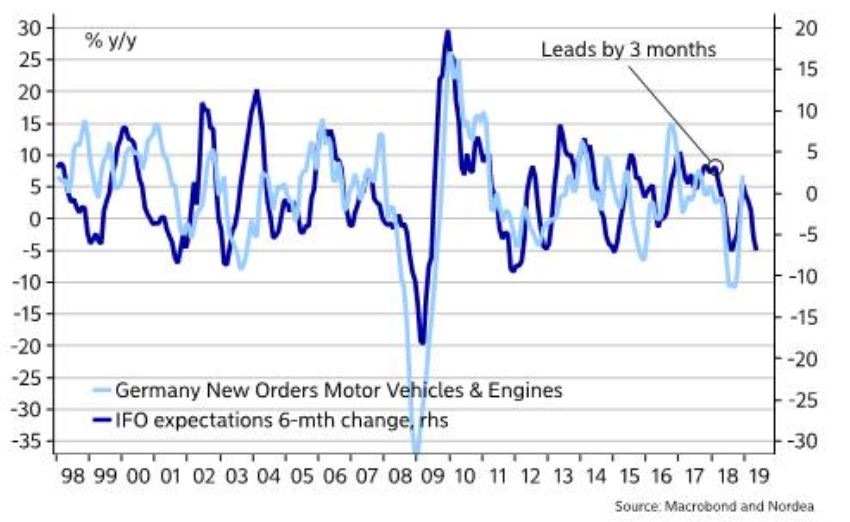 A vyzerá to, že pokles IFO indexu ešte neskončil. A to kvôli objednávkam v automobilovom priemysle, ktoré zvyknú 6-mesačnú zmenu IFO indexu očakávaní predbiehať o tri mesiace. V posledných troch mesiacoch sa tieto objednávky opäť dostali do mínusu. Je však potrebné povedať, že nové registrácie automobilov v EÚ v posledných mesiacoch rastú, čiže nie je vylúčené, že trend sa onedlho otočí.