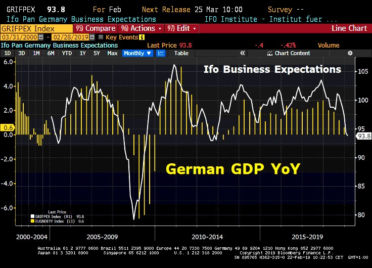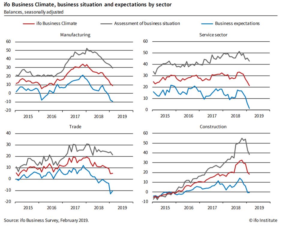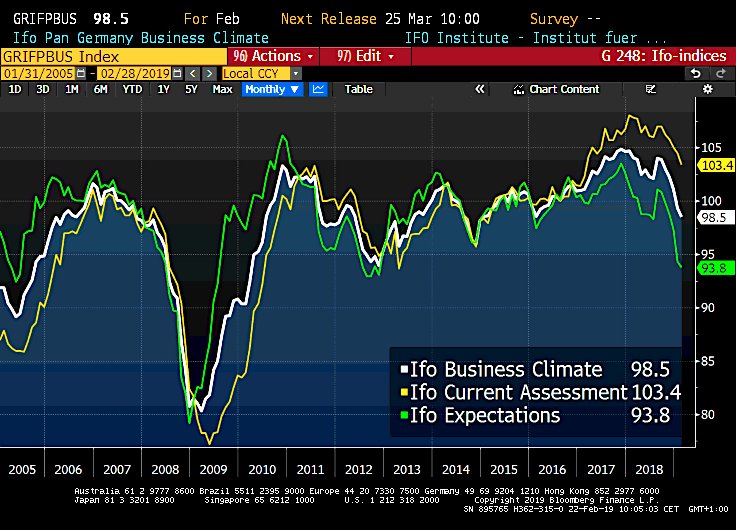 Včerajšie indexy dôvery z dielne Markit Economics ukázali zhoršenie nálady v nemeckej výrobnej sfére (ktorá je už v teritóriu kontrakcie), na druhej strane však ukázali zrýchlenie rastu v sektore služieb. Keďže sa služby podieľajú na ekonomike väčšou mierou, tak celková podnikateľská dôvera vzrástla na štvormesačné maximá. Dnešný IFO index to nepotvrdil a ukázal ďalší pokles z 99,3b. na 98,5b. (čakal sa miernejší pokles na 99b.). Aktuálna úroveň je najnižšia od roku 2014. Stále ju však ťahá nahor pozitívne hodnotenie aktuálneho ekonomického vývoja (a to aj napriek prudkému spomaleniu ekonomiky), očakávania sú však najhoršie od dlhovej krízy a pokiaľ ešte klesnú o zopár desatinných bodov, tak sa dostanú na najnižšiu úroveň od finančnej krízy.