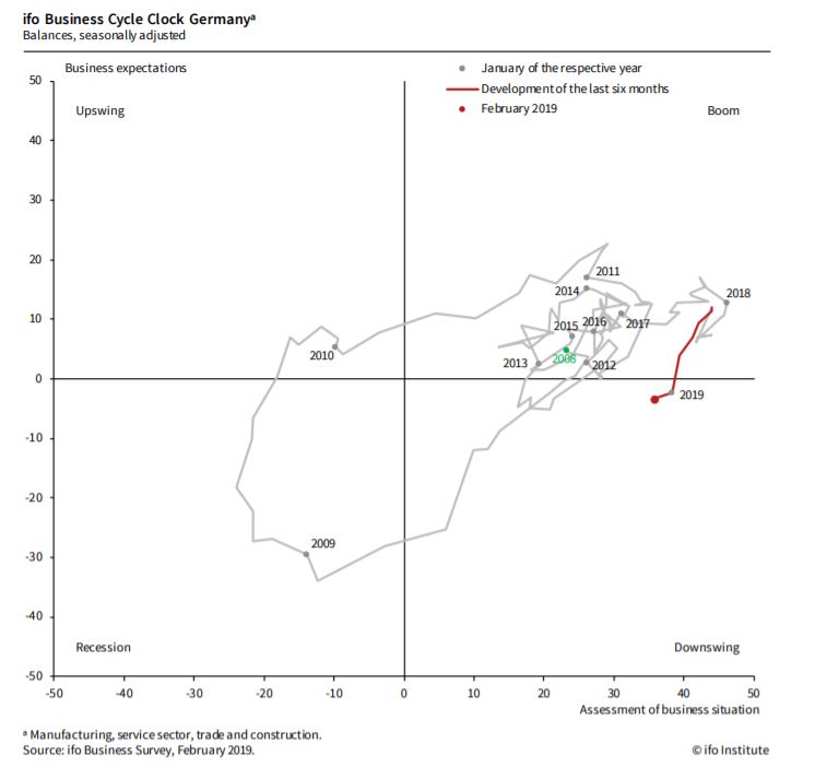 IFO inštitút zverejňuje spolu s IFO indexom aj odhad toho, v akej fáze cyklu sa nemecká ekonomika nachádza. Posledné dva údaje ukazujú, že aktuálne je vo fáze spomaľovania. Je však potrebné povedať, že od recesie je to stále ďaleko.