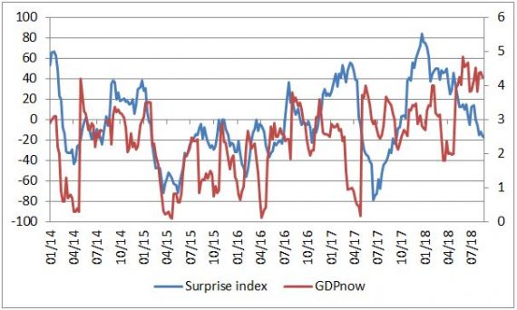 Vývoj indexu ekonomických prekvapení a real-time modelu rastu HDP z dielne FEDu