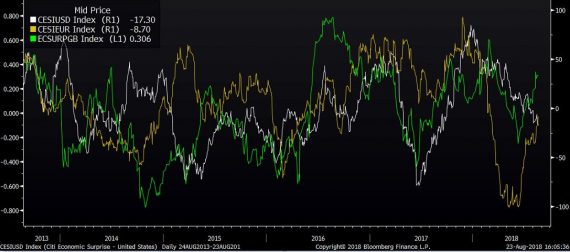 Ako sú na tom ostatné ekonomiky? Eurozóna sa vyhrabala z brutálneho mínusu, ktorého sme boli svedkami v jarných mesiacoch. Aktuálne je na tom zhruba rovnako ako USA. Naopak, prekvapovať začal index prekvapení pre Britániu, ktorý je v solídnom pluse.